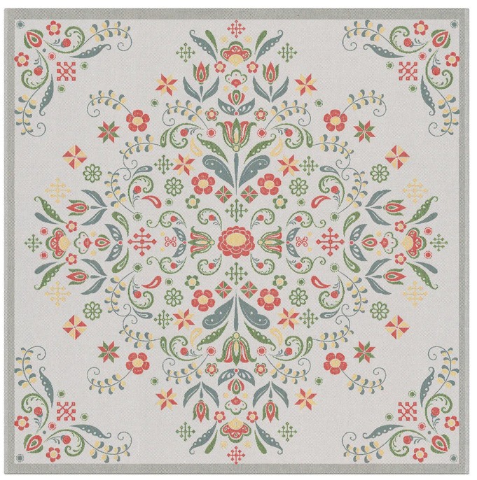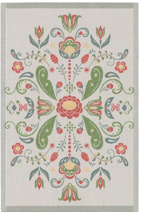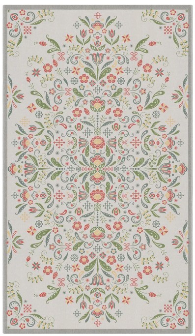 Het is een jacquard geweven collectie. Dit betekent dat het een ingeweven dessin is (dus niet bedrukt). Het bekend fraaie Zweedse kurbits art is in het dessin goed terug te zien. Het ontwerp is van Susanne Andersson.